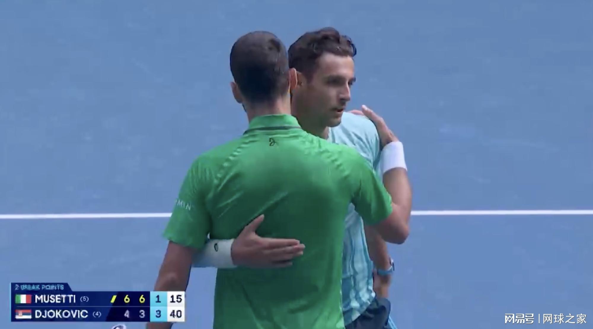 今天下午,2026年澳大利亚网球公开赛男单四分之一决赛现场,戏剧性的一幕让罗德拉沃尔球场的观众席陷入一片复杂的寂静中。意大利选手洛伦佐·穆塞蒂在盘分2-0领先、第三盘1-3落后的情况下,因意外受伤被迫退赛,将德约科维奇送入了他的第13个澳网半决赛。当拿下头上的发带走向德约科维奇时,这位意大利帅哥的脸上写满了不甘。打进澳网八强后,即时世界排名已升至职业生涯新高...